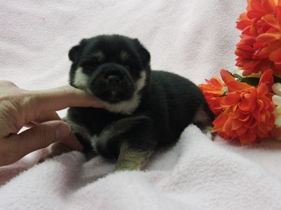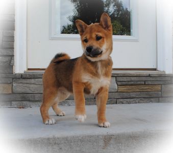 Red colored puppies - the darker/black snout generally complete disappears by the age of 8 - 10 weeks old. They will sometimes have some black sprinkling down their back, chest area and on the inside curl of the tail (red sesame).